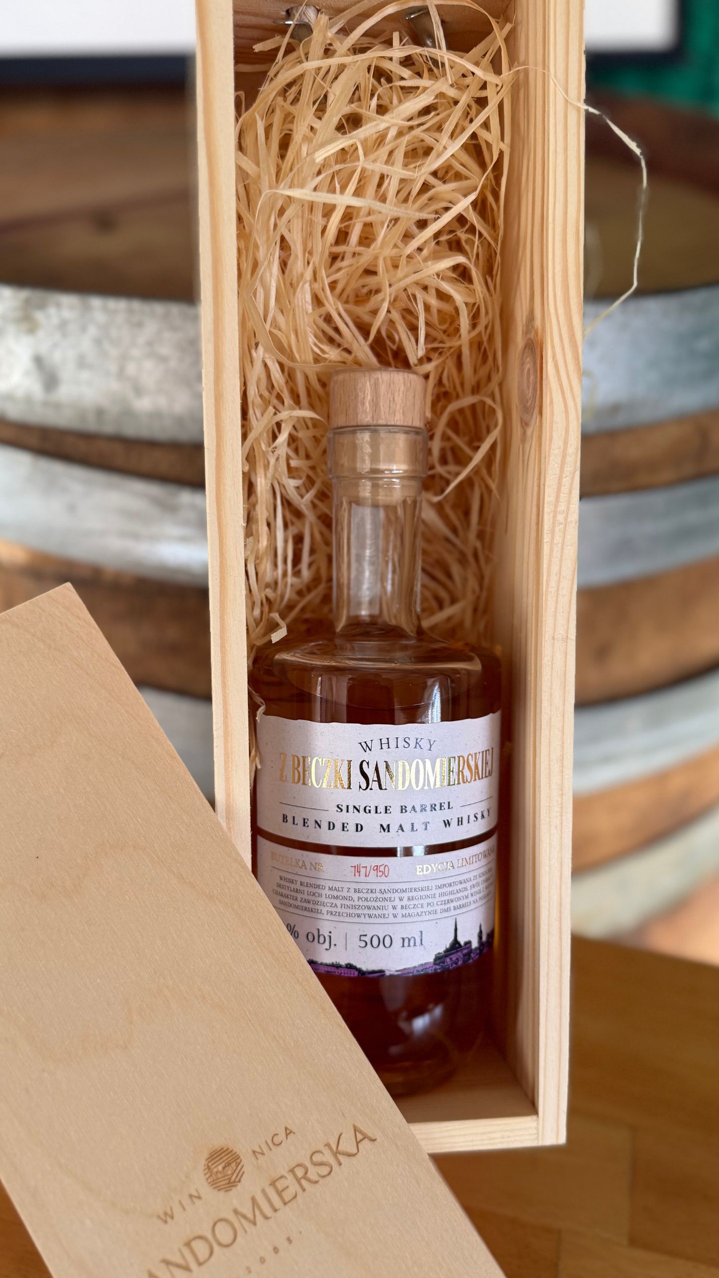 Whisky z Beczki Sandomierskiej to blended malt, który został importowany ze Szkockiej destylarni Loch Lomond z regionu Highlands. Ostatnie 6 miesięcy spędziła w beczce po czerwonym winie z winnicy sandomierskiej – w magazynie DMS Barrels na Podlasiu.